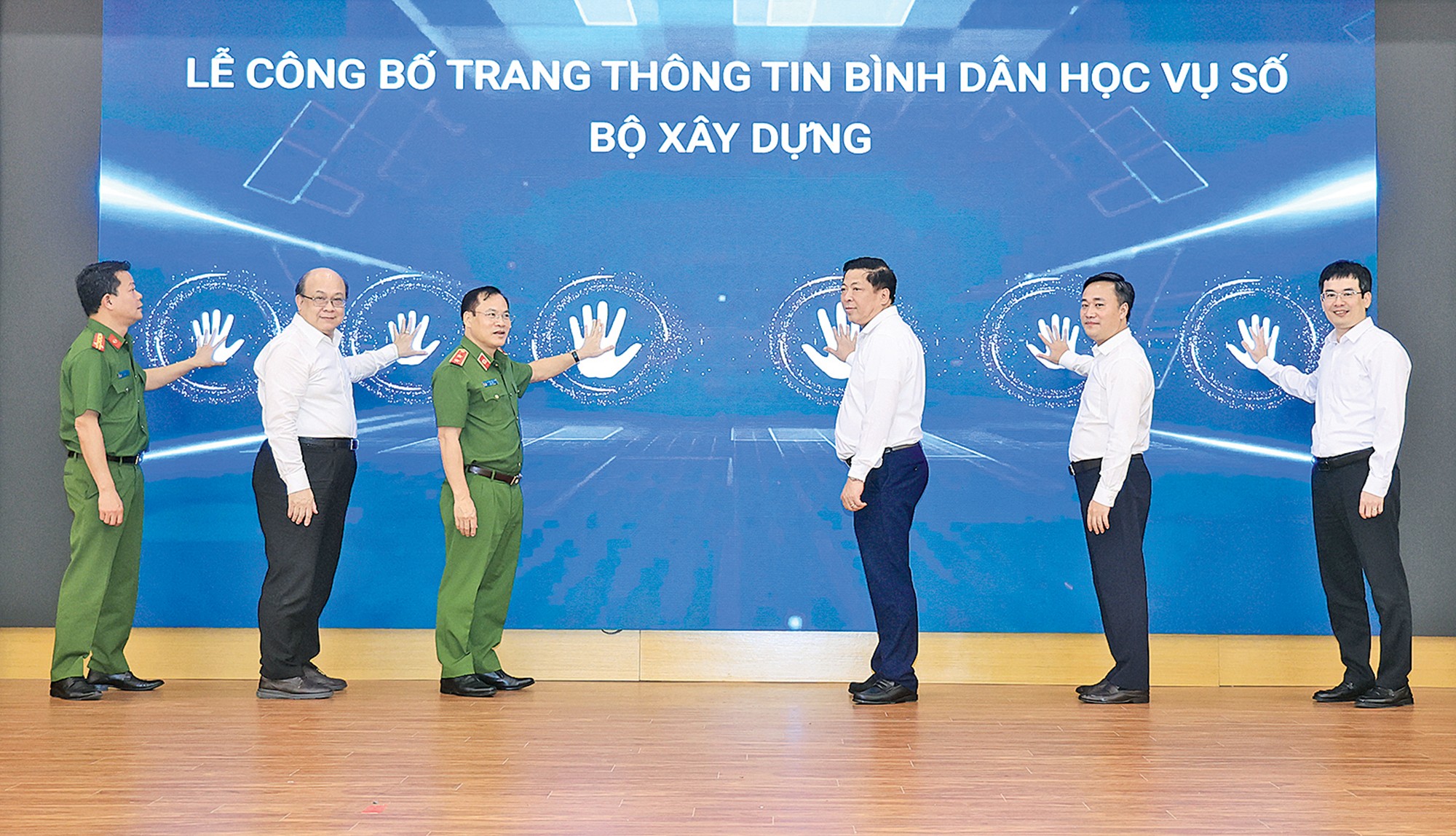 Lãnh đạo Bộ Xây dựng và Bộ Công an thực hiện nghi thức bấm nút khai trương Trang thông tin Bình dân học vụ số Bộ Xây dựng ngày 26/5/2025. Ảnh: Tạ Hải.